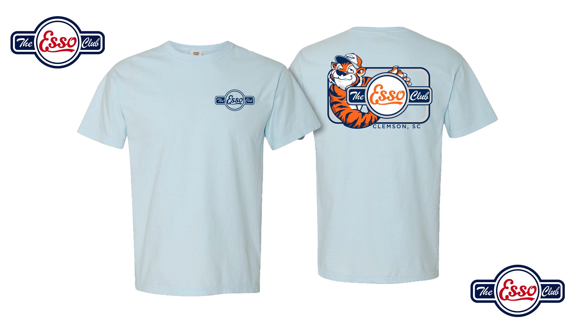 Comfort color shirt featuring our Otis The Esso Club Tiger. Available in small- 3XL. Short sleeve. Color choices are baby blue, dark blue and granite.