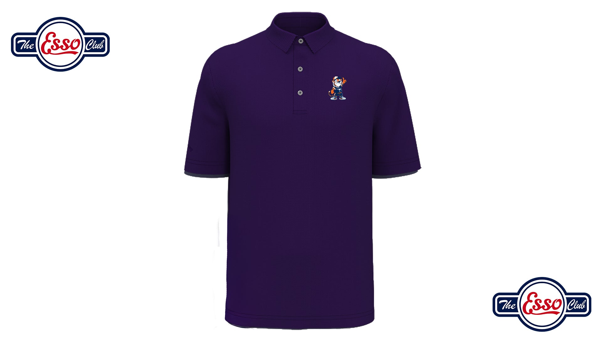 A Purple polo featuring Otis the Tiger holding up the number one on a high quality fabric. This design comes in orange, navy, purple, and special under armour prints on white and purple.